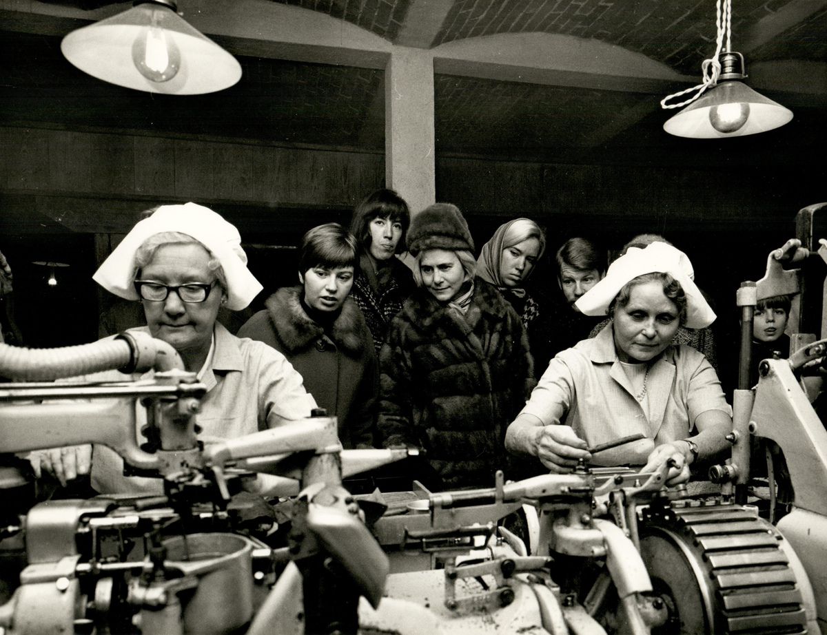 Museibesökare ser på när tobaksfabrikanter jobbar i "fabriken" i Tobaksmuseet.