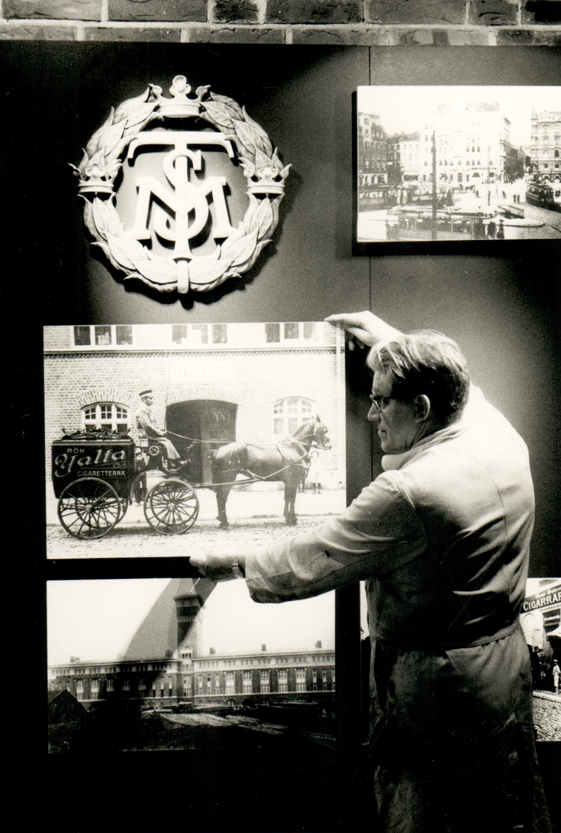 Gösta Rudin sätter upp en bild i det nyinredda Tobaksmuseet.