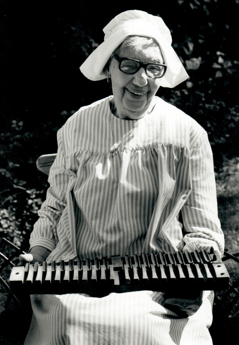 En kvinna anställd vid Tobaksmuseet sitter ute i solen.