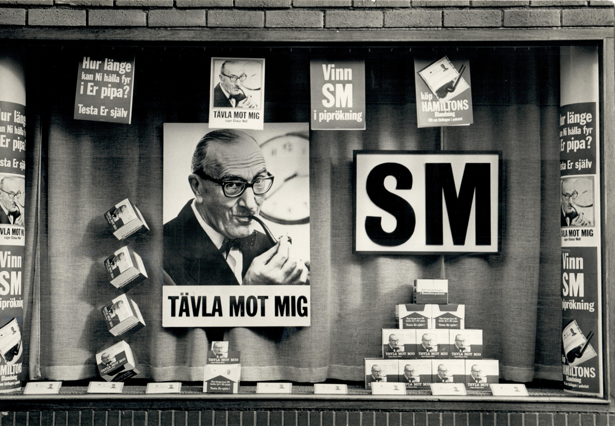 "Tävla mot mig", säger sportjournalisten Glokar Well. Reklam för SM i piprökning 1963 i ett skyltfönster.