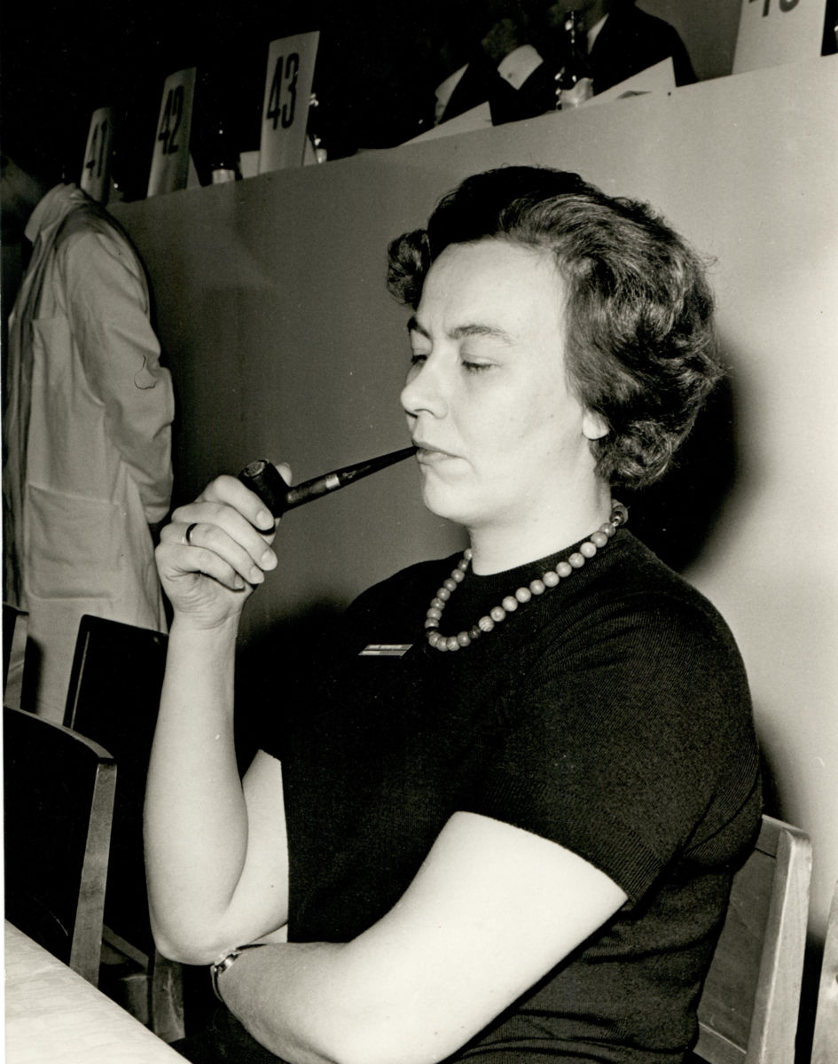 En kvinna deltar i SM i piprökning i Blå Hallen 1965.