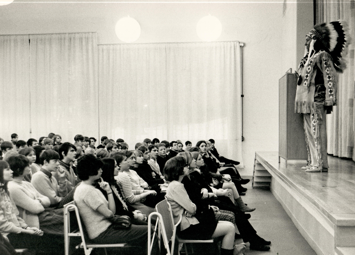 Hövdingen för Wampanoag-stammen från Gay Head, Lorenzo Dow Jeffers, håller tal för elever från Hässelbystrandsskolan, januari 1967.