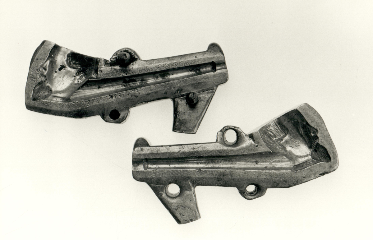 Två formhalvor i mässing. Bilden användes i Arne Åkerhagens bok "Pipmakare i Värmlandsskogarna: de sista kritpipsmakarna i Sverige".