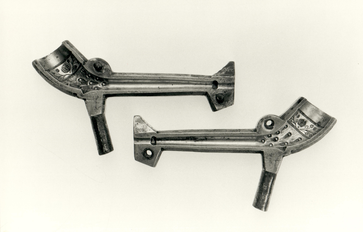 Två formhalvor i mässing. Bilden användes i Arne Åkerhagens bok "Pipmakare i Värmlandsskogarna: de sista kritpipsmakarna i Sverige".