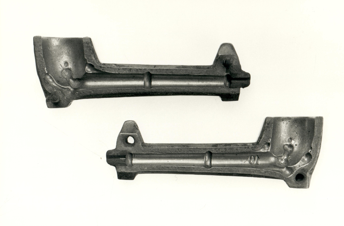 Två formhalvor i mässing. Bilden användes i Arne Åkerhagens bok "Pipmakare i Värmlandsskogarna: de sista kritpipsmakarna i Sverige".