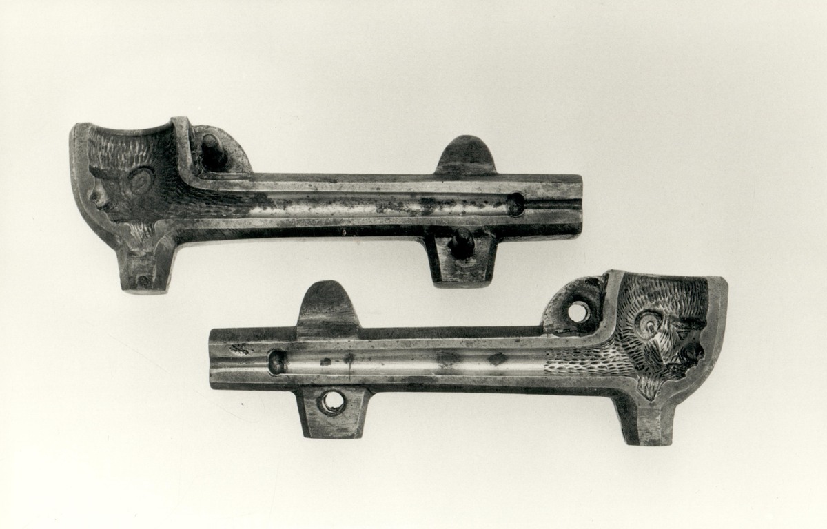 Titel: Två formhalvor i mässing. Bilden användes i Arne Åkerhagens bok "Pipmakare i Värmlandsskogarna: de sista kritpipsmakarna i Sverige".