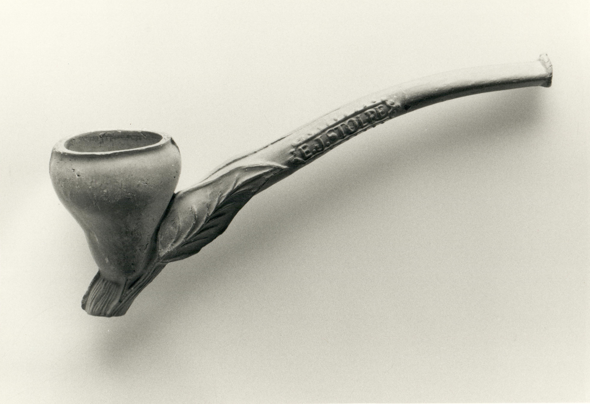 Kritpipa tillverkad i Emmanuel Stolpes pipbruk. Bilden användes i Arne Åkerhagens bok "Pipmakare i Värmlandsskogarna: de sista kritpipsmakarna i Sverige".