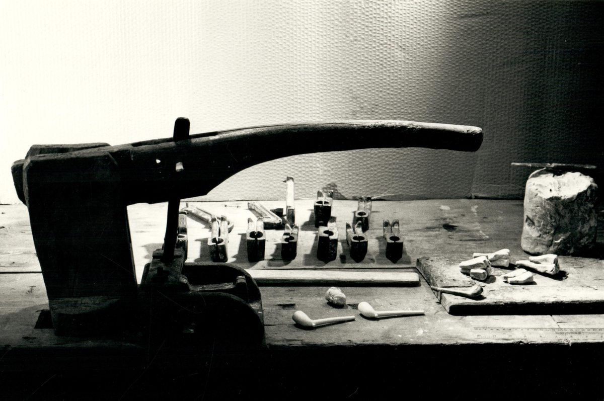 En pipmakares arbetsbord. Bilden användes i Arne Åkerhagens bok "Pipmakare i Värmlandsskogarna: de sista kritpipsmakarna i Sverige".