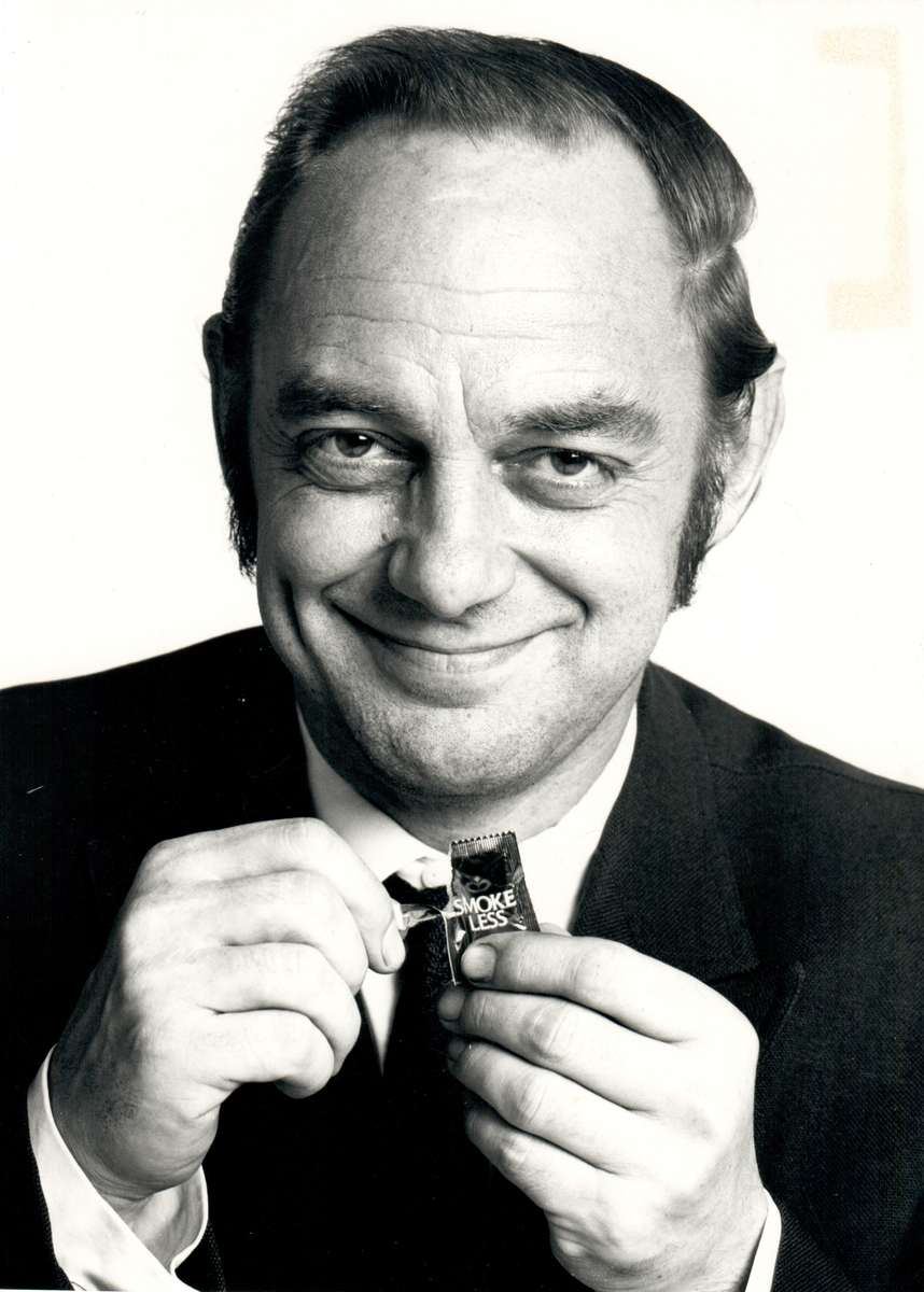 En man håller i Sveriges första portionssnus, Smokeless, som lanserades i februari 1973.