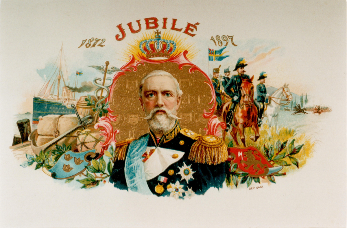 Etikett till cigarrlådan Jubilé som tillverkades av Brinck, Hafström & Co. 1897 i samband med firandet av Oscar II 25-årsjubileum som kung.