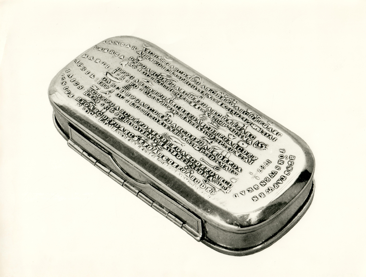 En tobaksdosa i mässing med bondepraktikan i relief på locket.