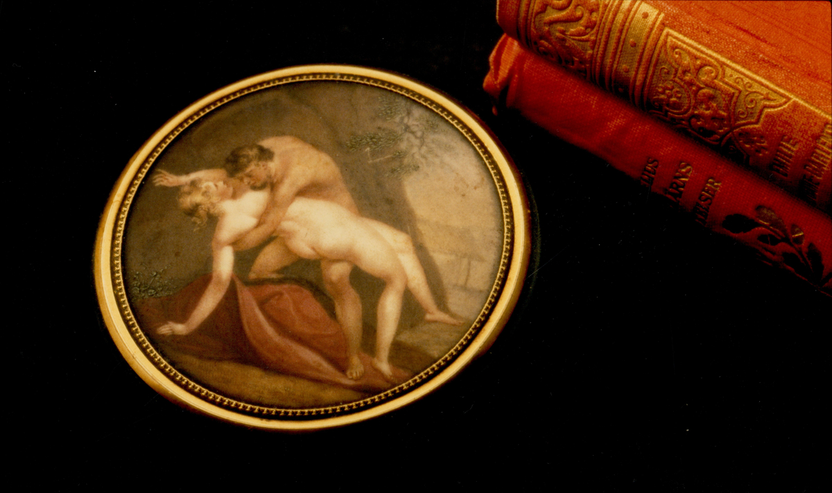Rund snusdosa av horn med konkava sidor, invändigt klädd med sköldpadd. På locket finns en erotisk miniatyr i olja föreställande en antikiserande, eventuellt mytologisk, scen med en naket par i omfamning. Ramen är av förgylld kopparlegering. Tillverkad i slutet av 1700-talet, okänd konstnär.