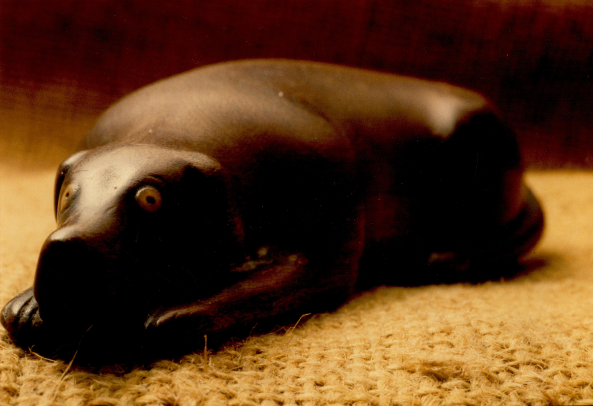 "Snushund" av trä med ögon av horn. Lock med gångjärn på undersidan. Har tillhört murmästare Hans Månsson, Lund (1839-1920). Tillverkad under 1800-talet.