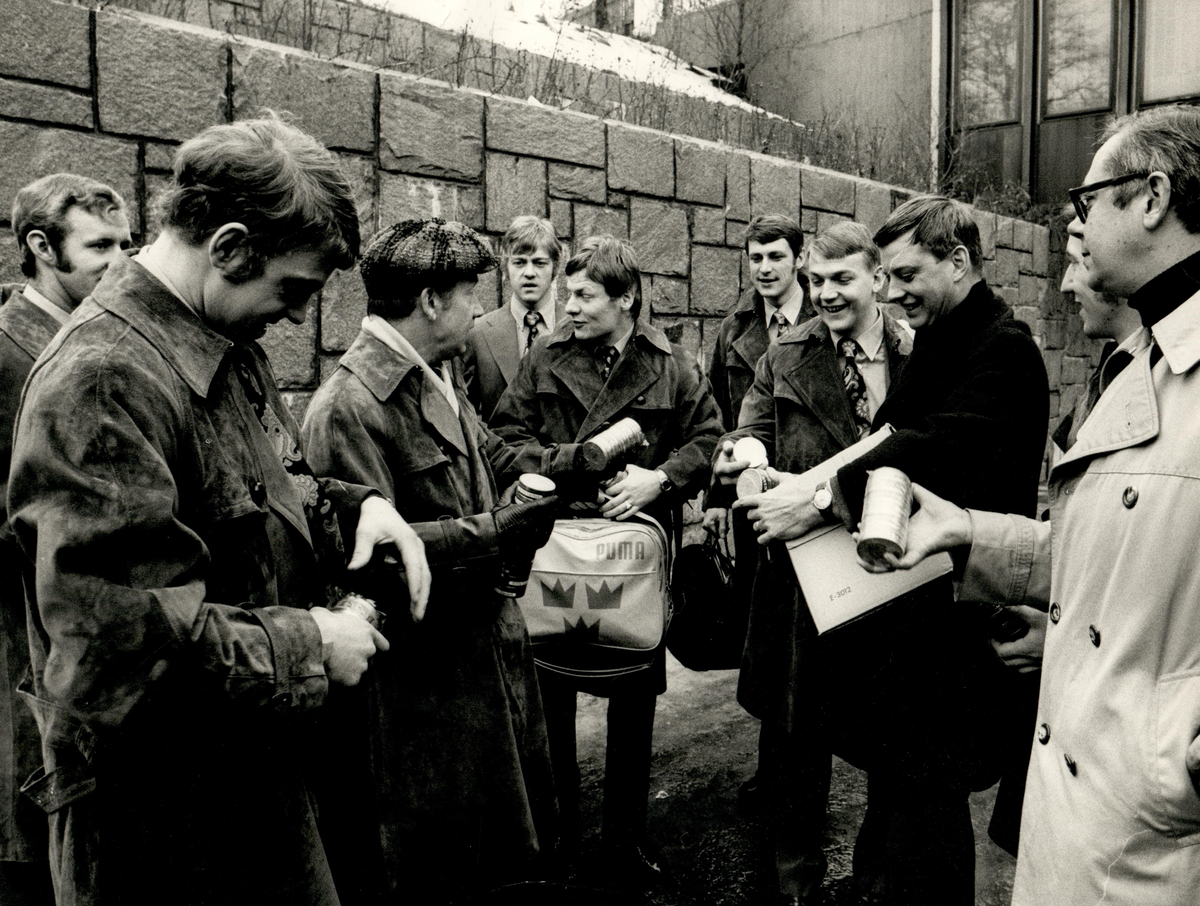 Snus delas ut till delar av den svenska VM-truppen i Ishockey VM 1971. Bland spelarna återfinns Kjell-Rune Milton, Christer Abrahamsson och Gunnar Andersson på bild. Sverige slutade trea i mästerskapet och tog därmed hem bronset.