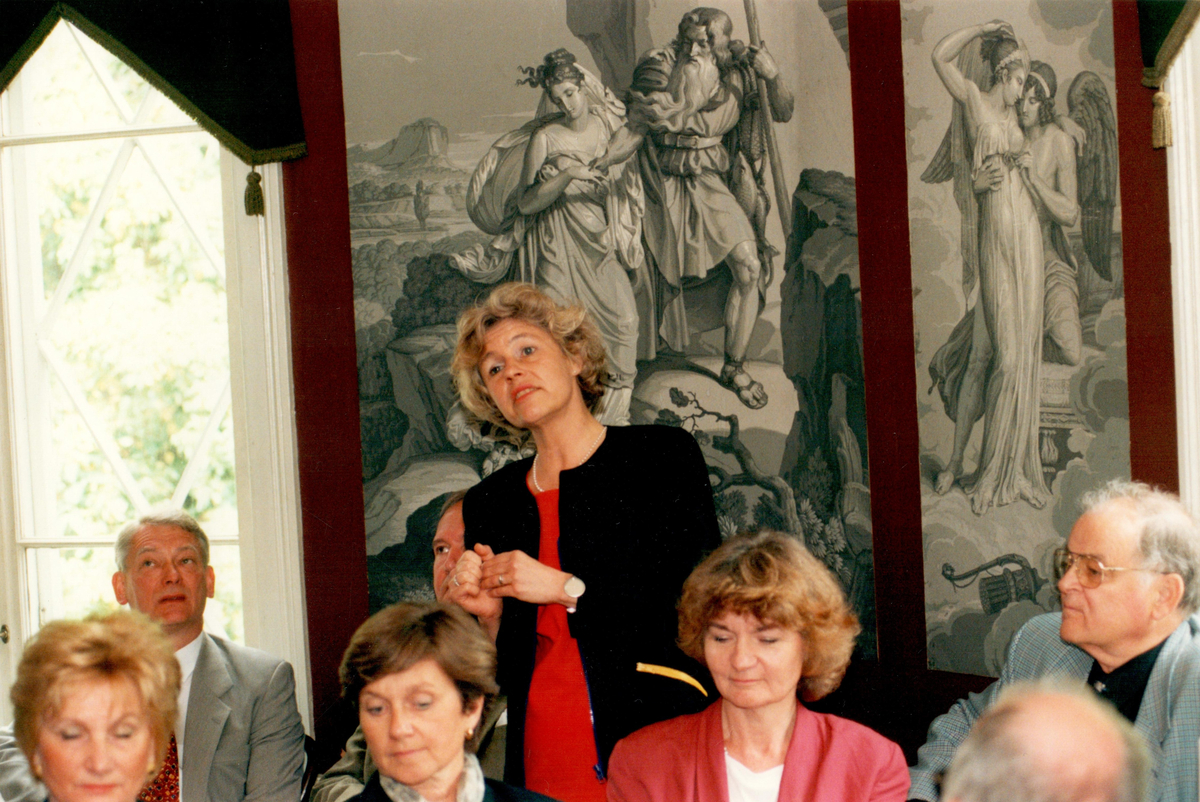 Inga Junhem talar vid invigningen av Snusboulevarden på Tobaksmuseet 1996.