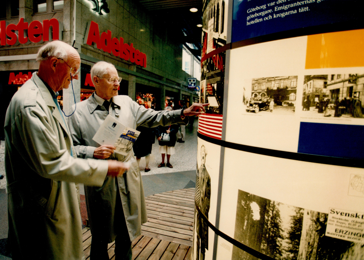 Lars Ljungmark, docent, och pekande Bogärde (?) står vid utställningen Snusboulevarden i Nordstan, Göteborg, 1996.