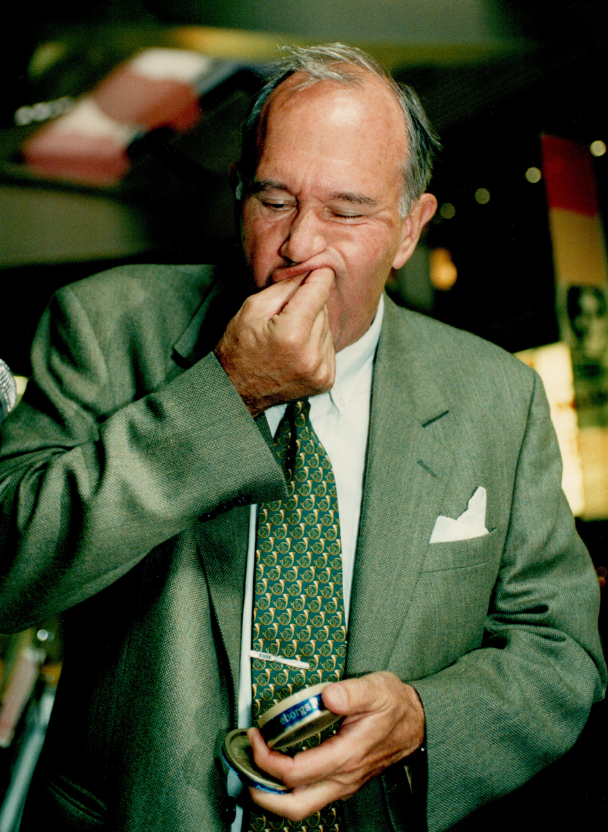 En man tar en prilla Göteborgs Rapé efter att ha hållit ett tal i samband utställningen Snusboulevarden i Nordstan, Göteborg, 1996.