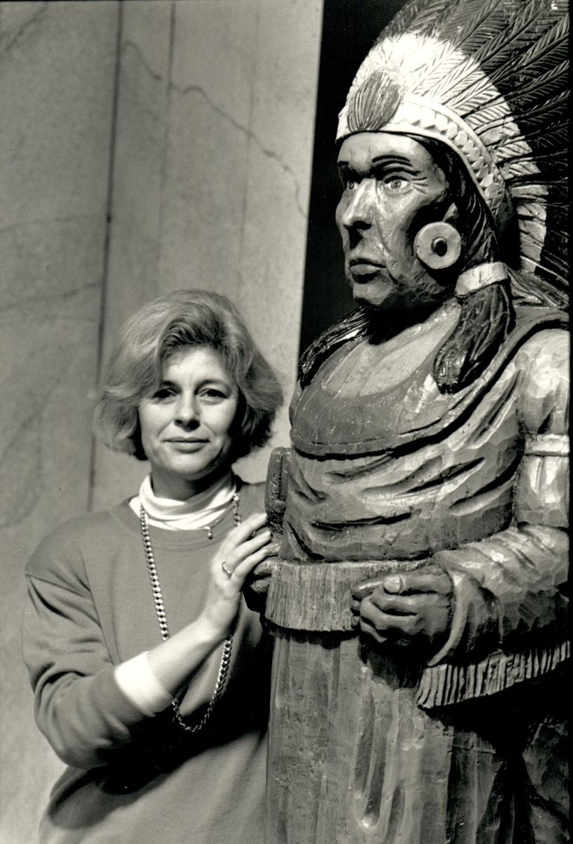 Inga Junhem står bredvid en staty i Tobaksmuseet 1989.