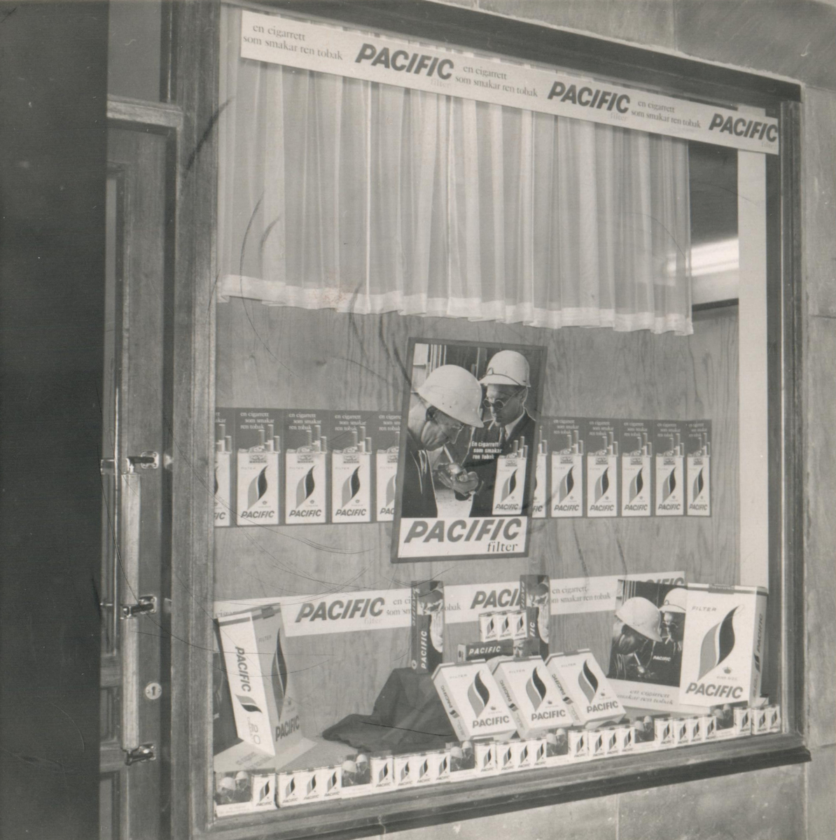 Ett skyltfönster med tobaksprodukter i en tobakshandel i Östersund.