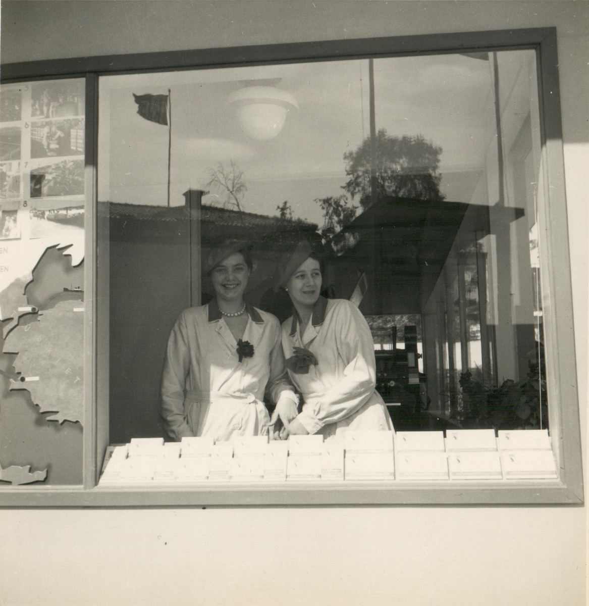 Två kvinnor står inuti tobaksmonopolets utställning vid jubileumsutställningen i Härnösand 1935.