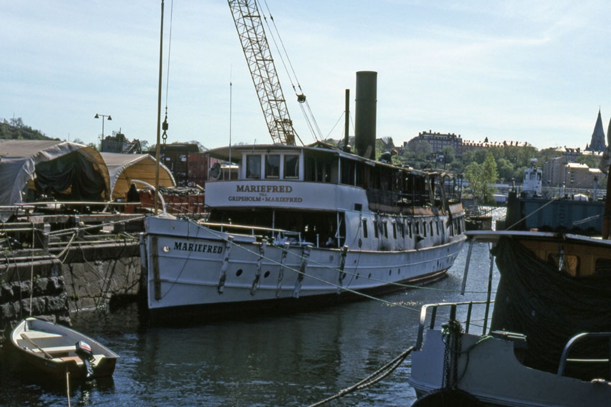 S/S Mariefred vid kaj efter branden i maj 1994. Beckholmen, Stockholm