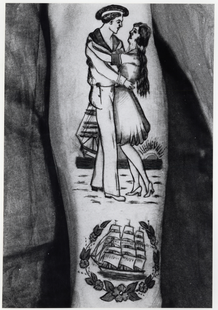 Vänster arm, elektriskt nålarbete, utfört av Carl Gustafsson, "Tatueringskalle" i Göteborg. "Avskedet" kostade 8.- kr, "skeppet" 2.50 kr.