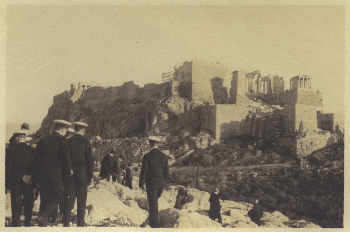 Svenska sjöofficerare på Areopagusklippan i Athen, med utsikt mot Akropolis. Bilden har uppenbarligen tagits då Gunvald Berger 1925-1926 deltog i pansarkryssaren FYLGIAs långresa till Medelhavet och Svarta havet 1925-1926.
