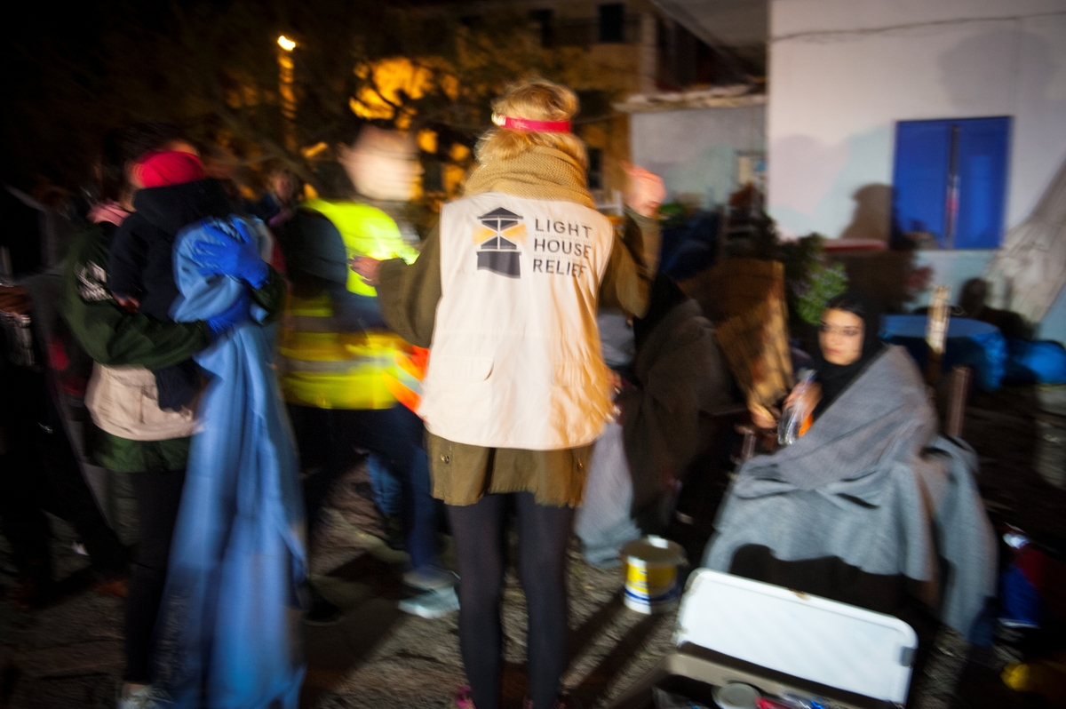 Hjälparbetare från volontärorganisationer hjälper migranter iland att få varma filtar och något att äta och dricka.
