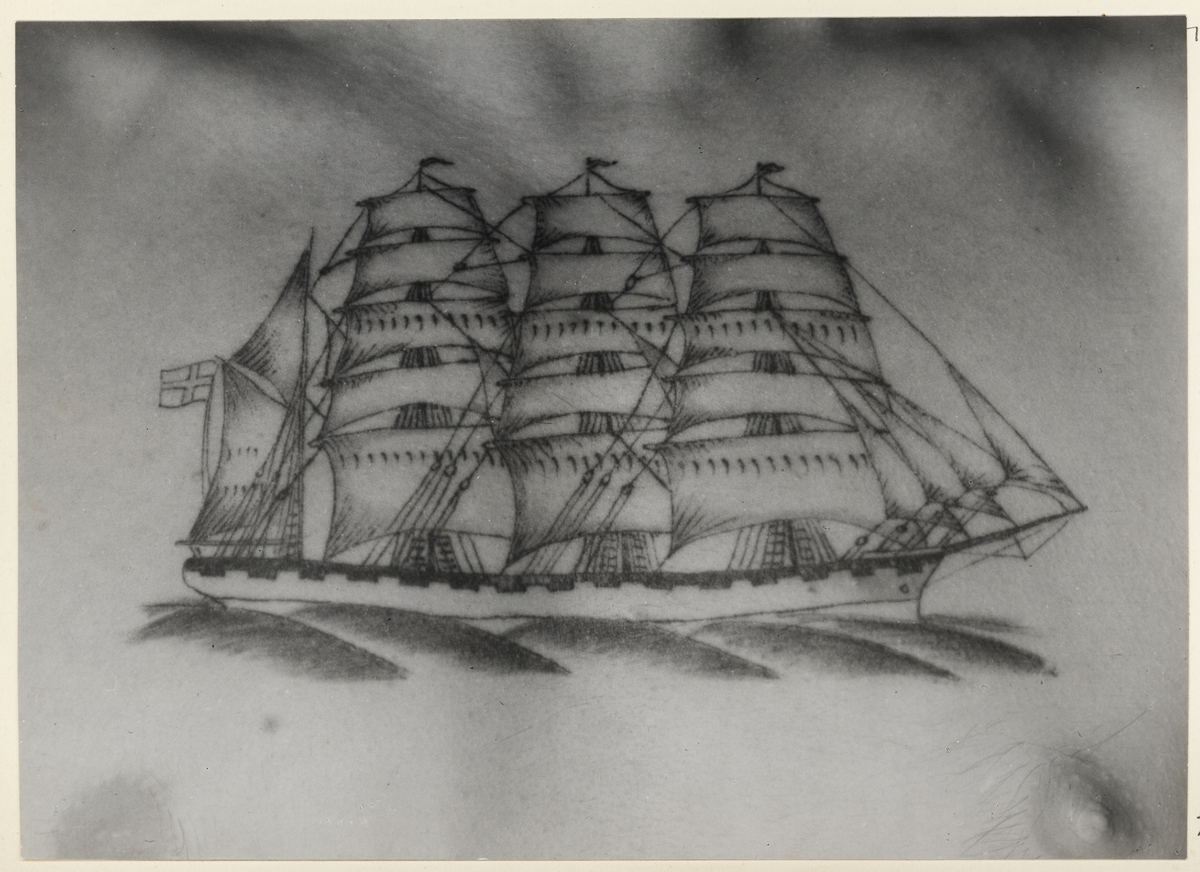 Bröstbild, 4-mastad bark, förande dansk flagg. Elektriskt nålarbete av Carl Gustafsson 1934 till ett pris av 8 kr ("Vänskapspris")