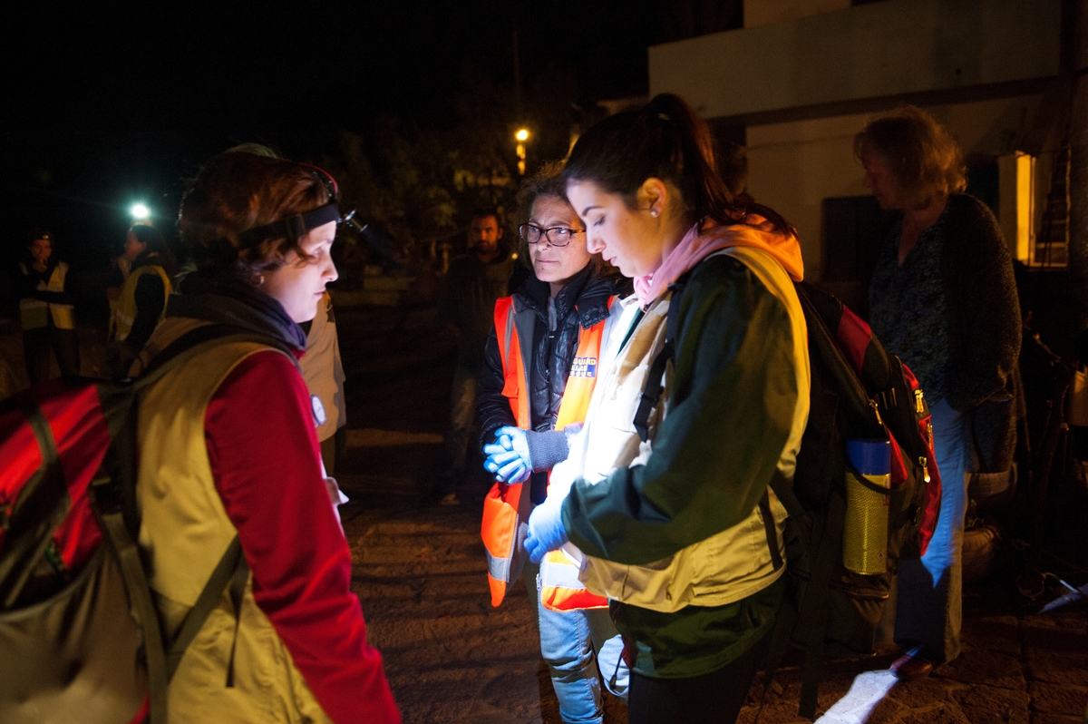 Läkare, sjuksköterska och volontär väntar på att få ta emot migranter vid hamnen i Skala Sikamineus.