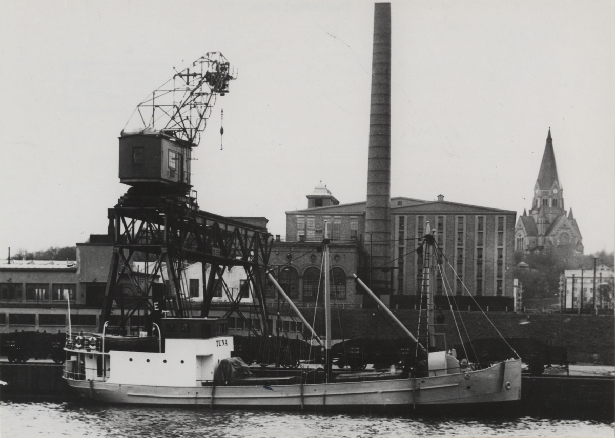 Lastångfartyget Tuna i Hammarbyhamnen. I bakgrunden Sofia kyrka.