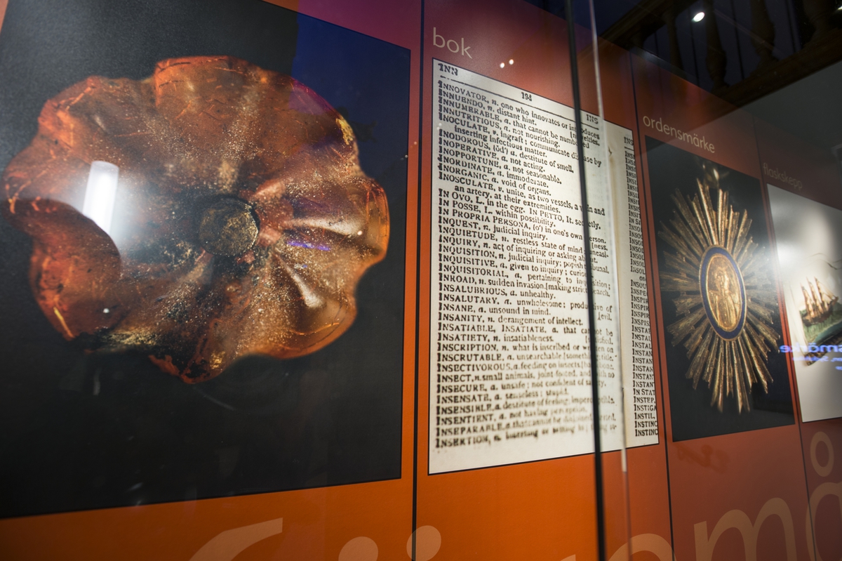 Trappmonterutställning på Sjöhistoriska som visar små föremål ur museets samlingar.