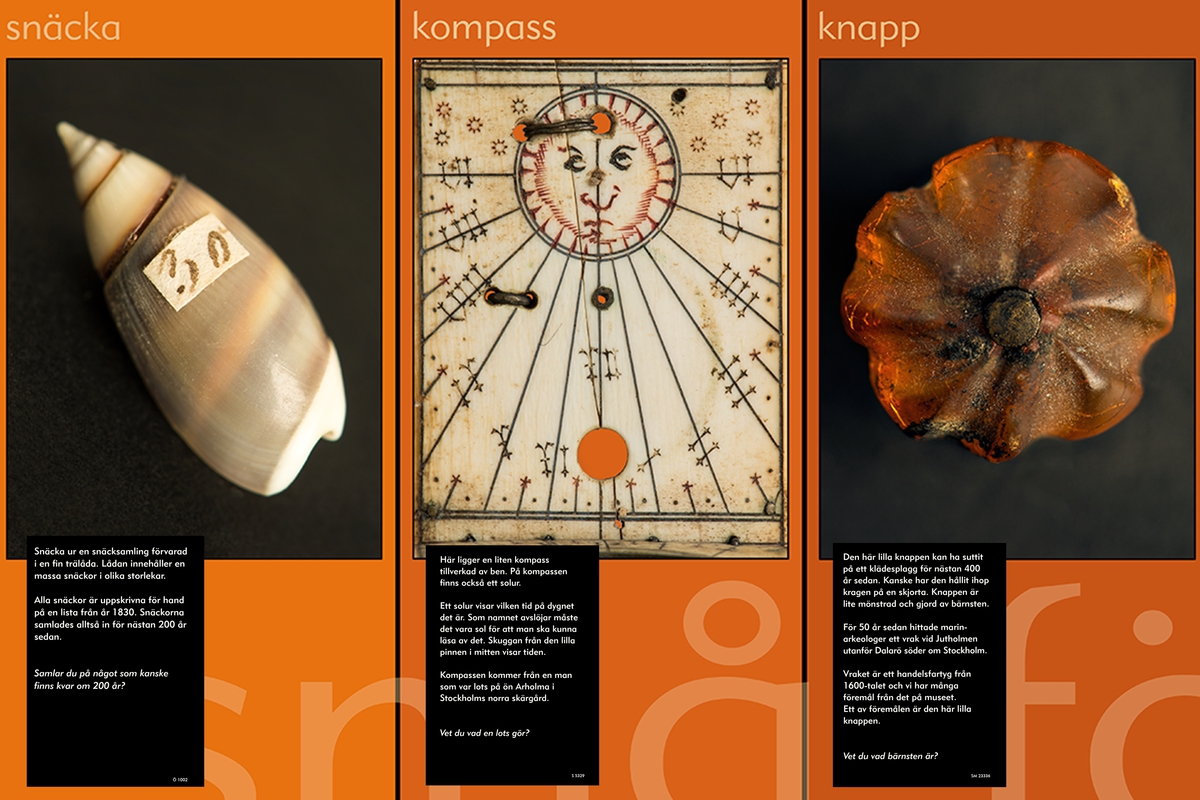 Trappmonterutställning på Sjöhistoriska som visar små föremål ur museets samlingar.