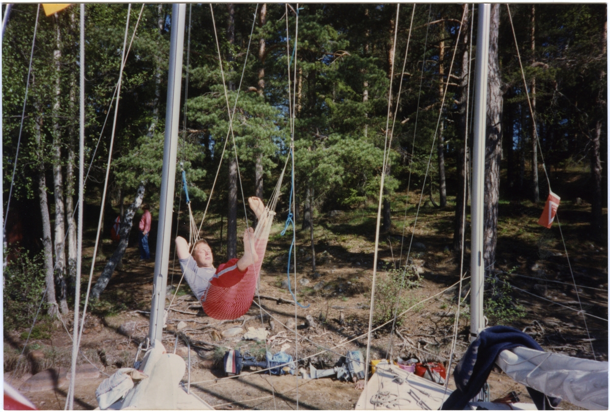 IF-båtliv. Man i hängmatta. Enl. givaren: "Inför Ornö Runt. Kontemplation 1994."