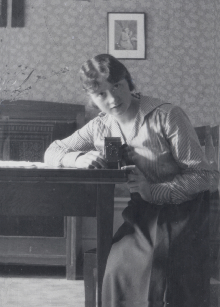 Alva Åkerlund, självporträtt i spegel taget med Ernemann-kamera.