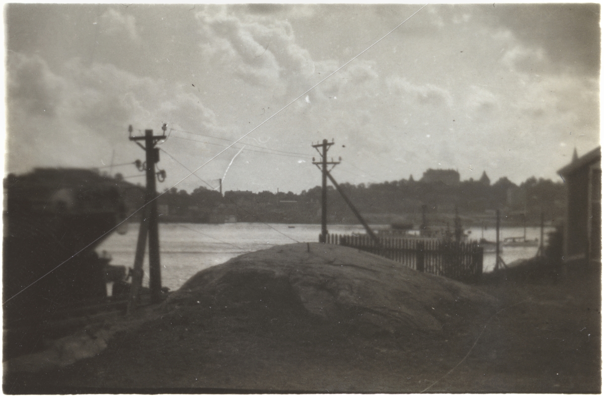 Vy från Beckholmen 1920-tal. T v fartyg i docka samt i bakgrunden berget Fåfängan på andra sidan Saltsjön. I förgrunden telefonstolpar, staket och t h gaveln av mindre träbyggnad.