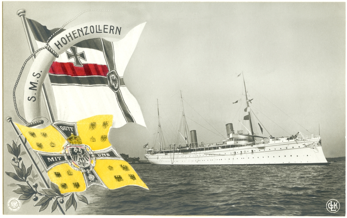 Vykort av den tyska kejserliga jakten HOHENZOLLERN, t v prytt med tyska örlogsflaggan, kejsarstandar med texten Gott mit uns, lagerbär och del av frälsarkrans med texten S. M. S. Hohenzollern.