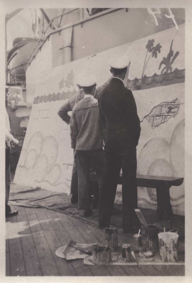 Tre officerare (?) ombord på fartygsdäck betraktar stor målning (teaterdekor?). Tid, plats och sammanhang okända.