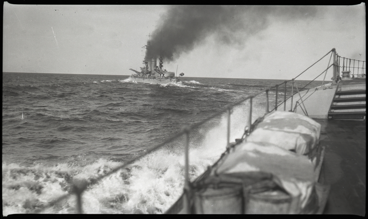Pansarskeppet DROTTNING VICTORIA till havs, fotograferat från pansarskeppet SVERIGE.