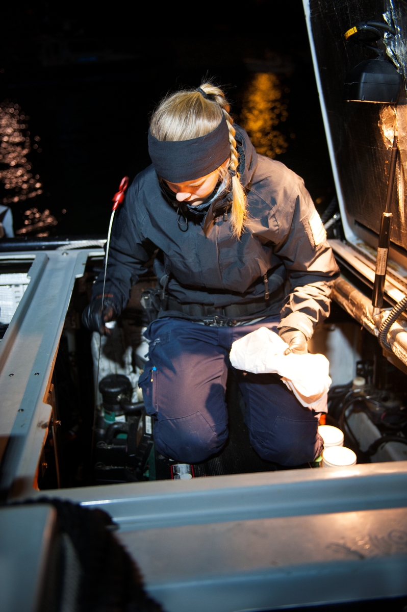 Maskinisten kollar oljan i motorn.