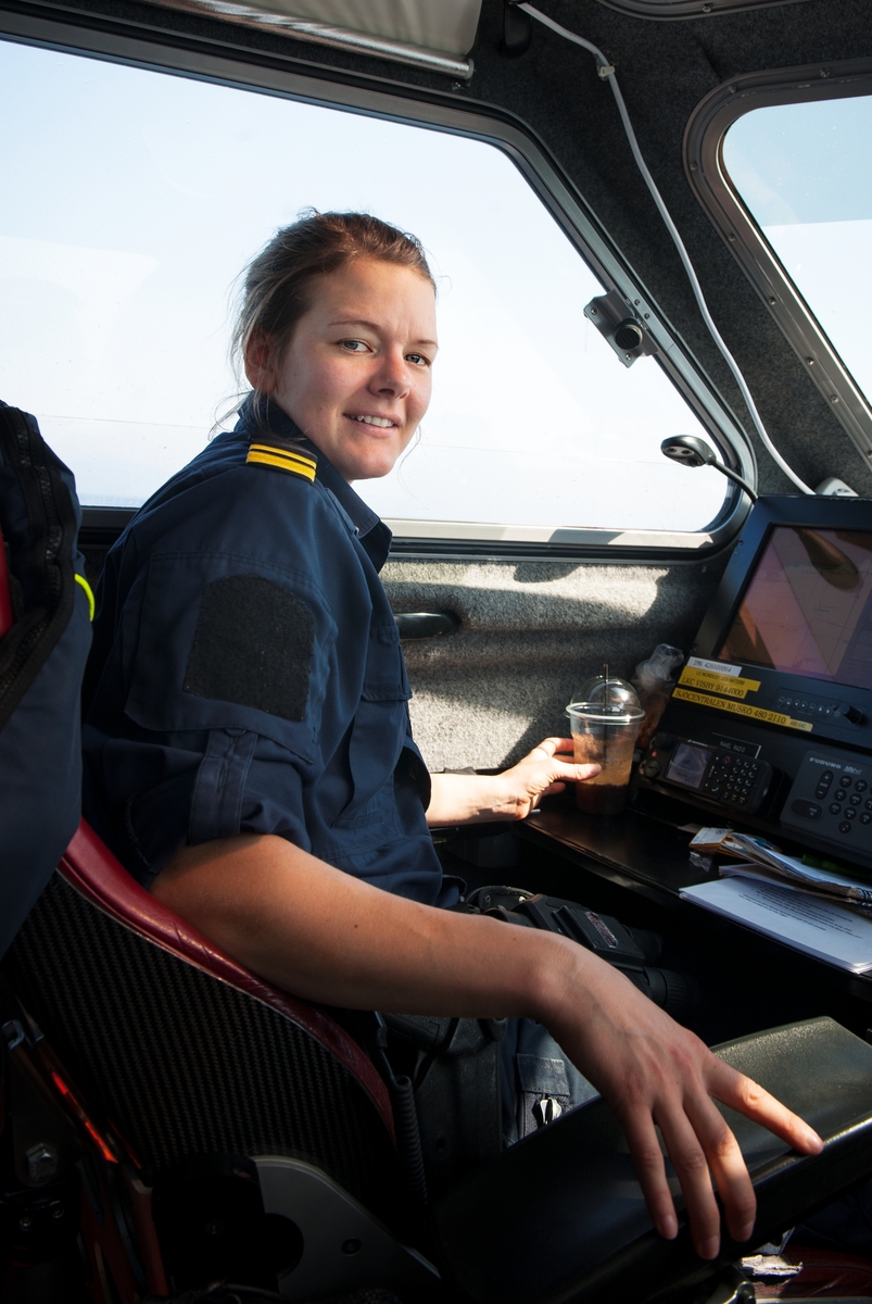 Maskinisten dricker kaffe vid navigationsdatorn.