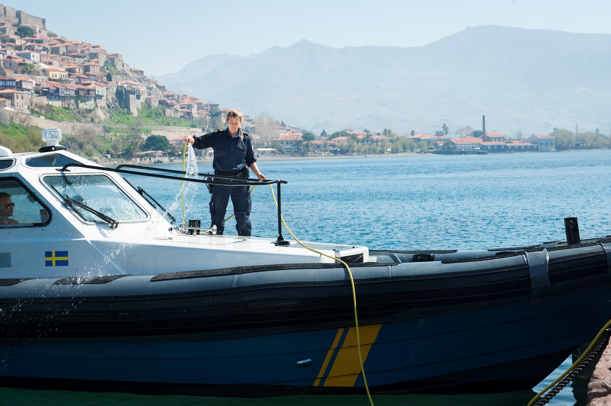 Maskinisten spolar av saltvatten från däck i hamnen i Molyvos.