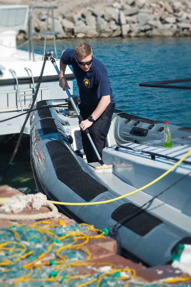 Besättningsmedlem skrubbar däck.