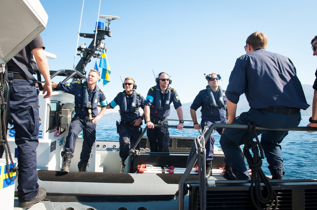 De två båtarna ses på havet för övning, besättningsmedlemmar på däck.