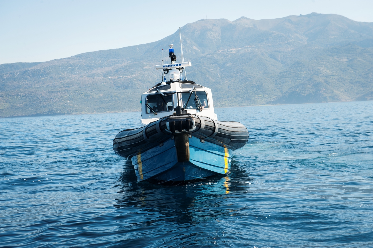 Kustbevakningens båt KBV 477 sedd förifrån.