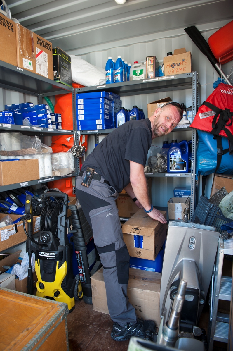 Teamledaren inventerar i förrådscontainern i marinan i Mytilini.