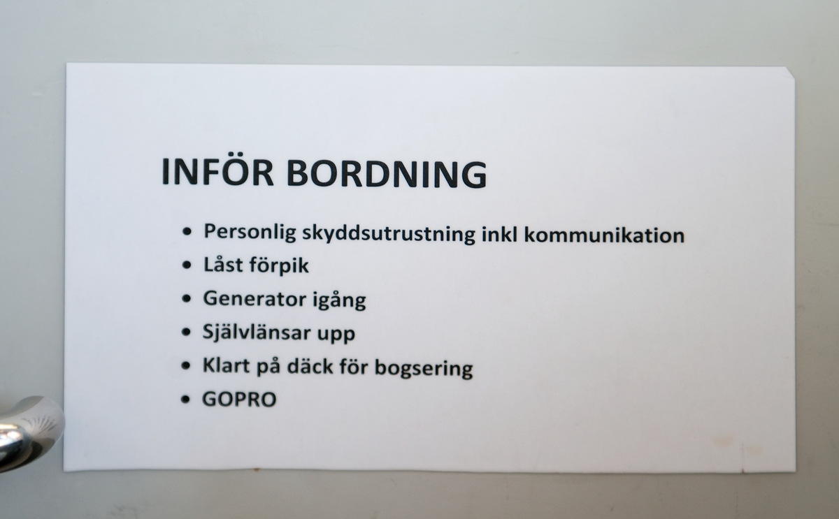 Skylt med instruktioner uppsatt i båten " inför bordning"