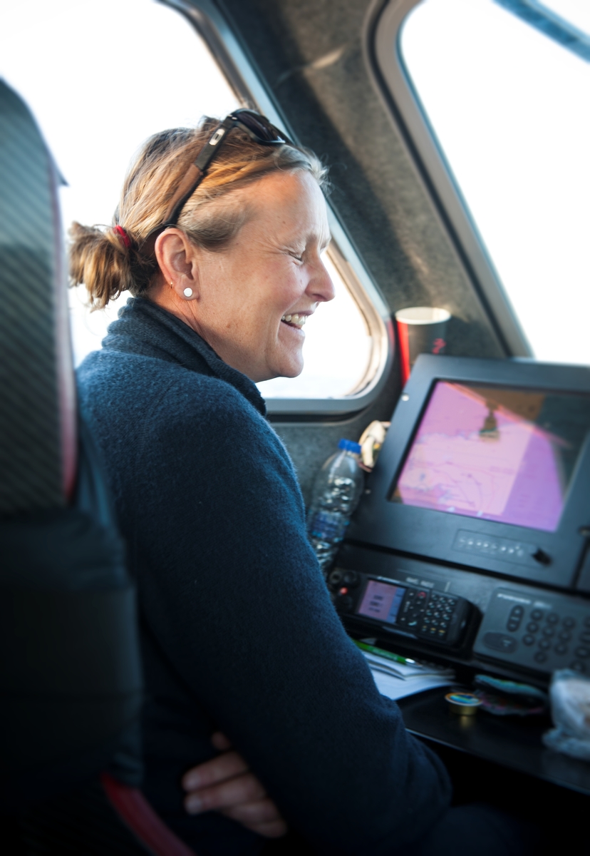 Navigatören tittar upp från sin plats vid navigationsdatorn.
