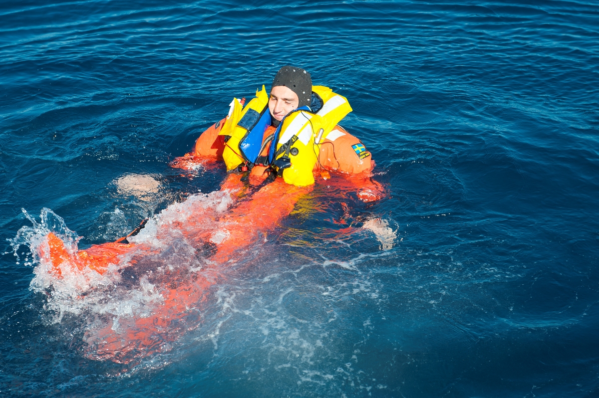 Besättningsmedlem ligger i vattnet med torrdräkt på.