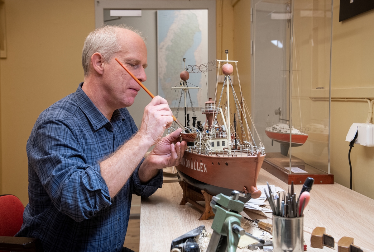 Modellbyggare Stefan Bruhn med en modell av fyrskeppet Grundkallen.